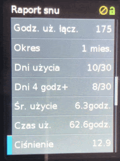 Licznik godzin użycia: długość ostatniej sesji z aparatem (długość snu z CPAP)