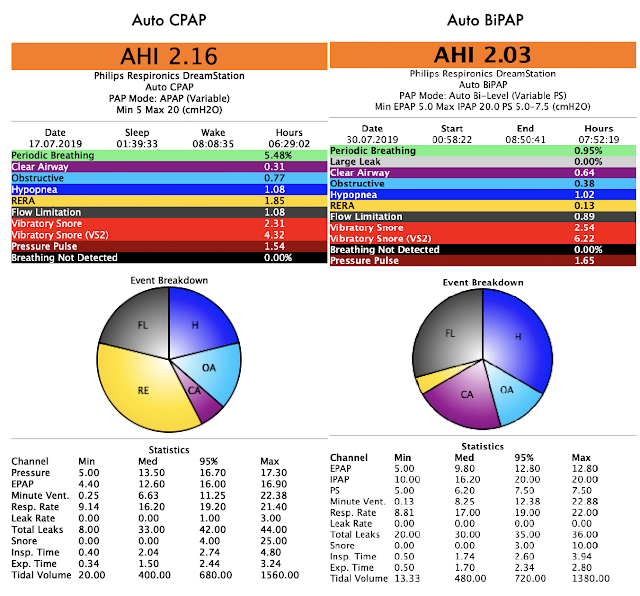 W moim przypadku terapia BiPAP  po prostu zwiększa deltę pomiędzy IPAP a EPAP ale średnia pozostaje na podobnym poziomie. Skuteczność obu rodzajów terapii jest podobna. Komfort terapii wyraźnie lepszy na BiPAP.