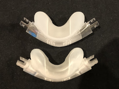 Jak pierwszy raz wziąłem tą maskę do ręki najbardziej obawiałem się o poduszkę podnosową. Wykonana jest oba z bardzo, bardzo cieniutkiego silikonu. Ale ona akurat nieźle przetrwała próbę czas. Nie tylko nic się nie uszkodziło, to silikon nie odbarwił się nawet o jotę. Dopiero jak zamieniłem ją na nową, okazało się przecieki się zmniejszyły. Uważne porównanie obu poduszek pokazało odkształcenia silikonu, które są za to odpowiedzialne (patrz zdjęcie poniżej).