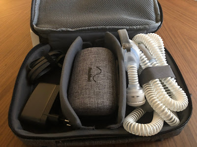 dodatkowo w futerał i torbę. Początkowo kupiłem tylko niewielki sztywny futerał na sam aparat, z myślą, że będę AirMini woził „luzem” w plecaku. Jest on tak mały, że spokojnie zmieści się nawet w kieszeni kurtki i to razem z maską… ale szybko się zorientowałem, że do tego dochodzi jeszcze rura i zasilacz. Dlatego koniec końców kupiłem także dedykowaną torbę na ramię. Jest niewielka i ma praktyczną kieszeń na dodatkowe „gadżety” w której umieściłem dokumenty i podręczne lekarstwa. Przy pustym plecaku torba w całości mieści mi się do środka, a jak muszę zapakować coś więcej, to ubieram ją na ramie i jest zdecydowanie mniejsza i wygodniejsza od tej z AirSense.