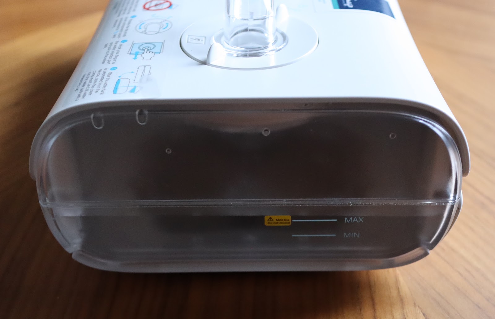 Z przodu mamy jeszcze 4 niebieskie diody, których funkcji nie mogę się domyślić. Początkowo stawiałem na to, że informują np. o stopniu nawilżania albo poziomie wody ale wydaje się, że jedynie denerwują mocnym światłem w nocy, które zdecydowanie zbyt wolno się przygasza po rozpoczęciu terapii. Pewnie to element mający na celu sprawienie, że aparat będzie po prostu lepiej wyglądał. No niech im będzie…