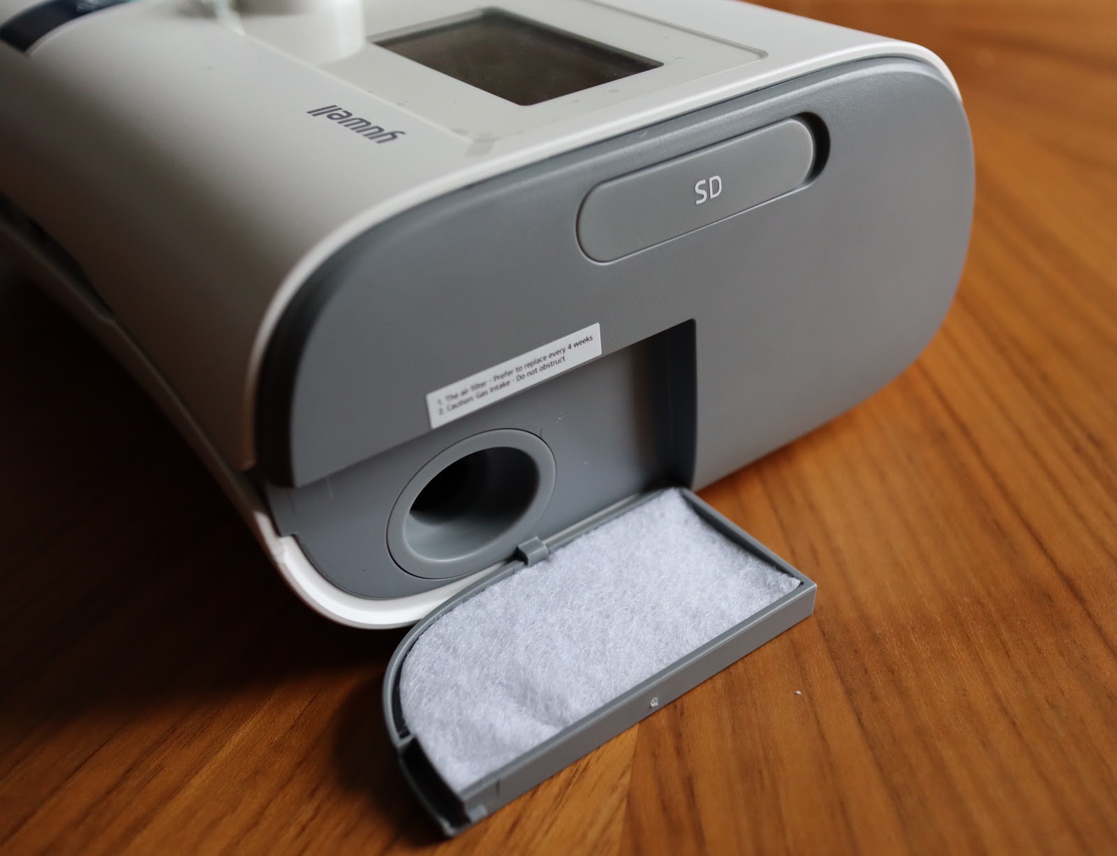 Podoba mi się bardzo konserwatywne podejście do interfejsu użytkownika. Aparat wyposażony jest w pokrętło pełniące także funkcję przycisku i dodatkowy klawisz „Home”. Identyczny układ znajdziemy np. w ResMed AirSense 10 i co więcej działają nawet dobrze znane wszystkim fachowcom „skróty klawiszowe” pozwalające dostać się do menu klinicznego. To niesamowicie ułatwi obsługę lekarzowi czy pracownikowi sklepu. Jak dla mnie super, że Yuwell nie zdecydował się tu na dotykowy ekran.