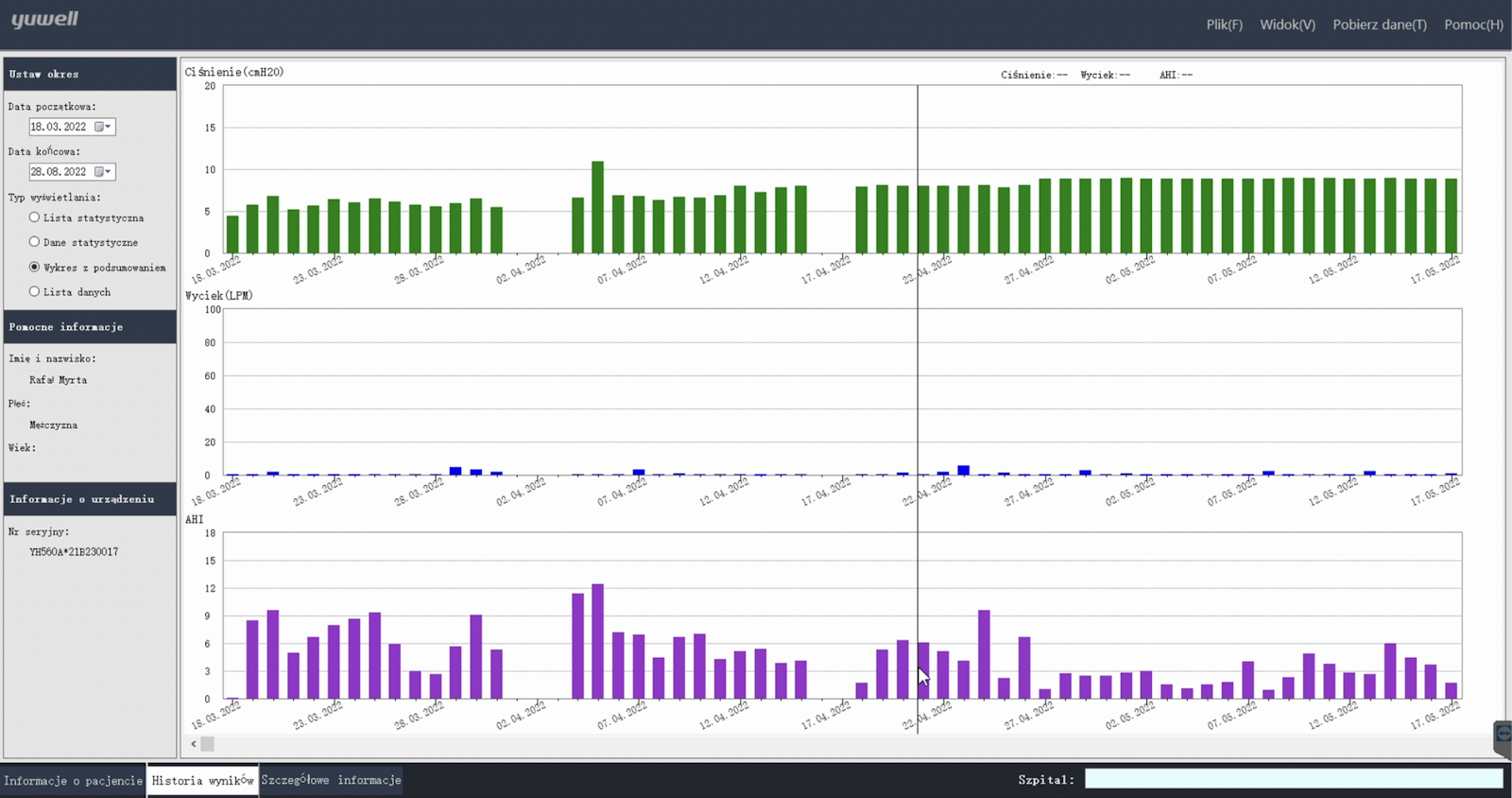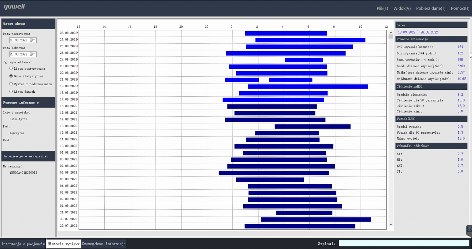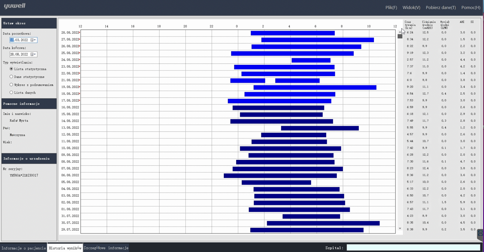 Każda linia w tej tabeli linia to osobna noc, a wykres szybko pokazuje jak długi i na ile regularny był nasz sen. Z prawej strony możemy szybko zweryfikować wskaźnik AHI, wyciek, czy ciśnienie terapeutyczne każdej nocy. Celem analizy polecam przełączyć z lewej strony na widok statystyki.