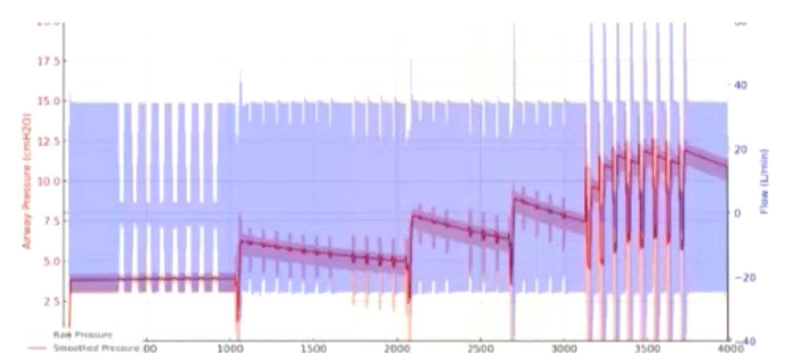Już w scenariuszu bezdechu centralnego widoczna była różnica między urządzeniami: jeden z konkurencyjnych aparatów gwałtownie podnosił ciśnienie – co naturalnie jest niepożądane – podczas gdy Yuwell YH‑690 pozostawał na poziomie bazowym. Z kolei przy symulowanych obturacjach Yuwell krok po kroku zwiększał ciśnienie wraz z narastaniem problemu. Takie zachowanie jest oczekiwane od dojrzałego algorytmu Auto CPAP: reagować wtedy, kiedy trzeba, i nie reagować w sytuacjach, które tego nie wymagają.