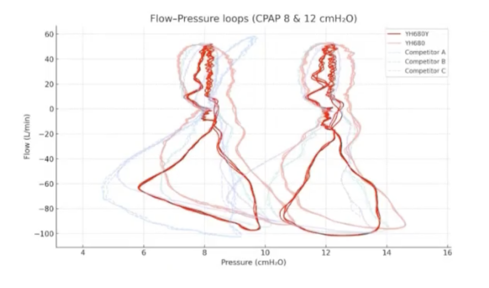 Dobry Auto CPAP to nie tylko reakcja na duże zdarzenia oddechowe, ale też stabilna, płynna praca przez całą noc. Chodzi o to, by ciśnienie nie „szarpało” przy każdym wdechu i wydechu. Idealnie, gdy aparat dostarcza powietrze tak gładko, że minimalizuje odczuwalne wahania. Jak to zmierzyć? W testach patrzymy m.in. na parametr ΔP (delta P) -to różnica między maksymalnym a minimalnym ciśnieniem w trakcie pojedynczego oddechu. Im mniejsze ΔP, tym mniej wahań ciśnienia odczuwasz w czasie wdechu i wydechu. Mierzymy też tzw. pole pętli ciśnienie–przepływ, które powstaje, gdy wykreślimy zależność ciśnienia od przepływu powietrza. Mniejszy obszar tej pętli oznacza mniejszą dodatkową pracę włożoną w oddychanie z aparatem.